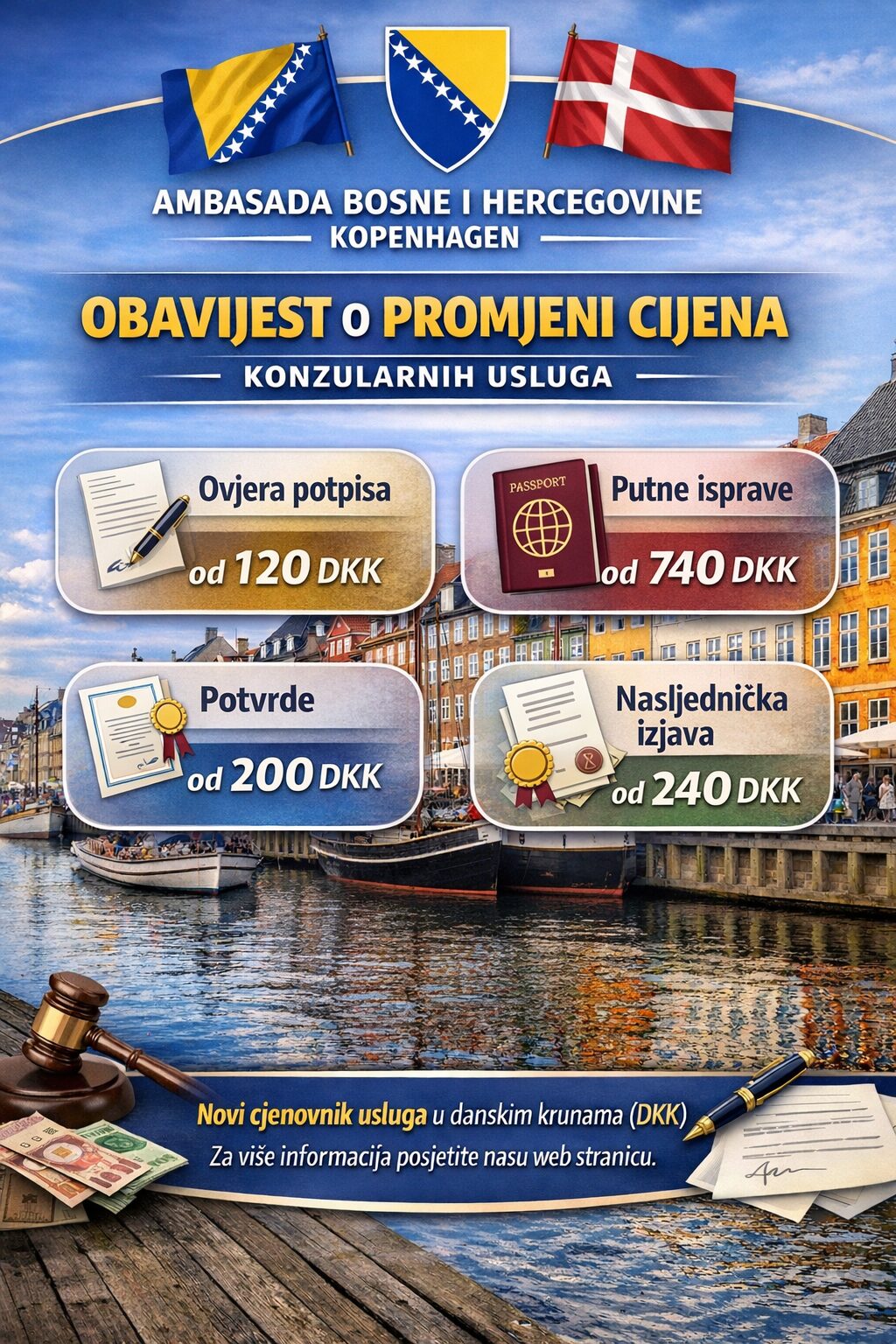 Obavještavamo građane da je došlo do promjene cijena konzularnih usluga Ambasade Bosne i Hercegovine u Kopenhagenu. U nastavku se nalazi novi cjenovnik usluga. Sve takse su izražene u danskim krunama (DKK).